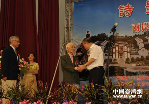 5月30日,李鴻忠在彰化市彰泰中學(xué)會見著名詩人余光中和鄭愁予先生。(圖片來源:湖北省臺辦)