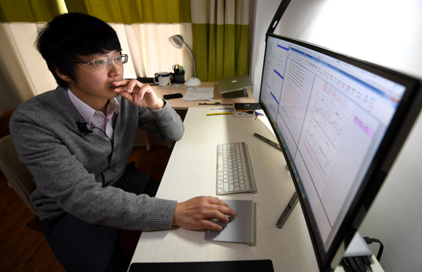 黃志偉在宿舍檢索學術資料。新華社記者 程敏 攝