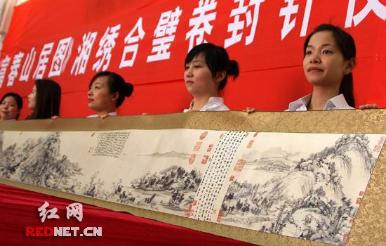 為此,湖南省沙坪湘繡博物館經多方努力求得一幅《富春山居圖》合璧卷全圖復制件,由省資深文博專家原長沙市博物館副館長、湖南省沙坪湘繡博物館執行館長魏明擔綱,湘繡藝術家羅國斌、黃歡愉等專家加盟成立繡研專家組,指導30多位刺繡大師,運用湘繡的針法與現代的先進工藝進行刺繡再創作,歷時五個月,精心繡出了與原作相同尺寸的極品湘繡合璧長卷。該長卷長達13米,已于今天上午在湖南省沙坪湘繡博物館封針。