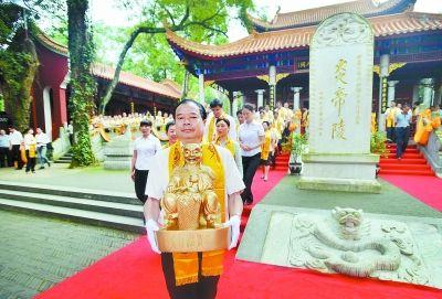 當天清晨,謁陵廣場鑼鼓聲震天動地,龍獅勁舞虎虎生風。7時09分,起駕儀式正式開始。擊鼓九通,鳴炮,奏樂,現場肅穆、莊重。隨著祭祀音樂的響起,身著古裝的年輕小伙抬著貢品緩步拾階而上,將三牲五谷、時鮮貢品敬獻于炎帝祀像前神案上。嘉賓們向炎帝神農氏敬獻花籃,深鞠三躬,肅誠敬虔。恭讀告文完畢,帛書化作裊裊青煙,告慰始祖先靈。在眾人的注視和期待中,炎帝圣駕移駕至鑾輿。禮炮、音樂再次響起,起駕儀式圓滿告成。