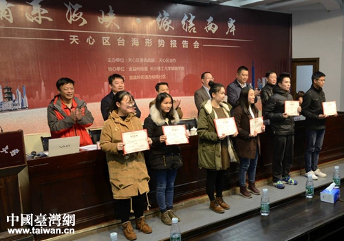 長(zhǎng)沙市臺(tái)辦主任袁義和、天心區(qū)委常委、統(tǒng)戰(zhàn)部長(zhǎng)等領(lǐng)導(dǎo)給2016年度涉臺(tái)教育征文獲獎(jiǎng)?wù)哳C獎(jiǎng)