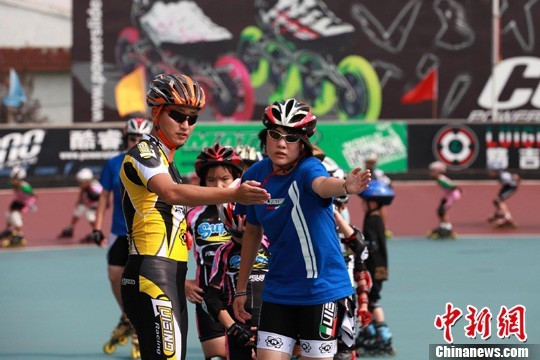 圖為兩位輪滑少年訓練起跑技術。中新社發 李克祥 攝