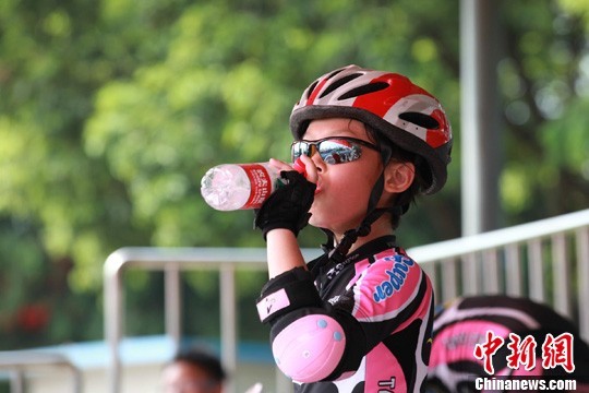 圖為一位輪滑少年在運動后補充水分。中新社發 李克祥 攝
