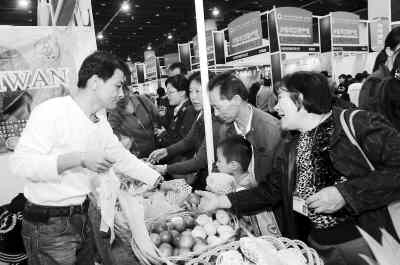 11月1日,120家臺灣農林企業,共212個展位,以臺灣農林特產館集體亮相2009中國義烏國際森林產品博覽會。圖為臺灣水果展柜前購買水果的人群。張建成攝