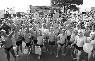 通過“小三通”航線首次參加日月潭國際萬人泳渡活動的福州冬泳隊員們,在開幕式上當(dāng)聽到主辦方主持人呼喚自己的隊伍時,群起歡呼響應(yīng)。(資料圖片)