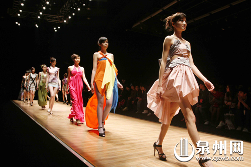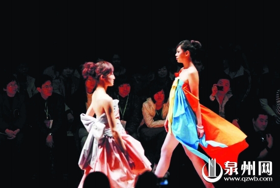 泉州商品博覽會暨第十三屆海峽兩岸紡織服裝博覽會、2010休閑服裝博覽會昨日在石獅服裝城開幕,首日達成交易額27.25億元,接待觀眾6.7萬人次。圖為模特在海博會國際時裝周首場服裝發布會上走秀。