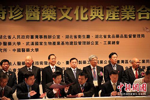 4月20日,海峽兩岸中醫(yī)藥界在臺北簽署了兩岸中醫(yī)藥合作倡議書、戰(zhàn)略合作協(xié)議書和企業(yè)項(xiàng)目合作意向書,共推兩岸中醫(yī)藥產(chǎn)業(yè)合作發(fā)展。當(dāng)天,第三屆海峽兩岸李時(shí)珍醫(yī)藥文化與產(chǎn)業(yè)合作發(fā)展論壇在臺北舉行。中新社發(fā) 羅欽文 攝