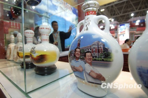 5月18日,貼有馬英九、蕭萬長肖像的臺灣白酒亮相第十二屆海交會。當日,由國臺辦、中國貿促會、海關總署、國家質檢總局和福建省政府共同主辦的第十二屆海峽兩岸經貿交易會、第七屆中國福建商品交易會在新落成的福州海峽國際會展中心開幕,近萬名海內外客商赴會。 中新社發 王東明 攝