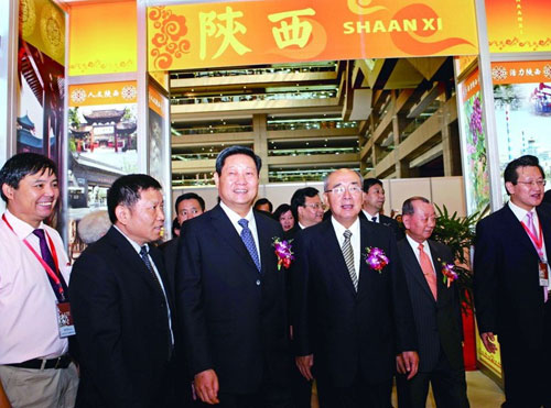當日上午九時許,在悠揚古樸的秦腔曲牌聲中,“陜西風情節”在臺北世貿中心拉開帷幕,近百家企業的300多種產品吸引了諸多臺灣民眾。趙正永、景俊海和吳伯雄以及臺灣商業總會理事長張平沼等在參觀展覽之后,出席了活動開幕式。趙正永在致辭中說,兩岸經濟具有很強的互補性,不斷加強交流與合作,對于應對國際金融危機和促進經濟持續發展具有重要意義。隨著“三通”的實現,陜臺兩地的交流合作領域不斷擴大、態勢越來越好。為進一步凝聚共識、互惠發展,在臺灣有關方面的大力支持下,我們赴臺舉辦包括“陜西風情節”等許多活動在內的“2010臺灣陜西周”,相信這次活動會使臺灣企業和民眾更多地了解陜西,推動陜臺合作向更高層次發展。吳伯雄在致辭中對我省舉辦臺灣陜西周表示熱烈歡迎,他說,秦中自古帝王州,陜西是中華文化的發祥地,工業基礎較好,資源豐富,有眾多的高校和科研單位,與臺灣有著良好的往來,臺灣陜西周文化交流、認親拜友、科技聯盟的主題,都是與臺灣合作中非常重要的問題,陜西也具備這樣的條件和基礎,希望以這次活動為新的契機,不斷推動陜臺合作向更多更寬的領域發展。作為陜西省政府高級經濟顧問的張平沼,以切身經歷說明了大陸與臺灣加強合作的重要性,表達了進一步加強合作的愿望。