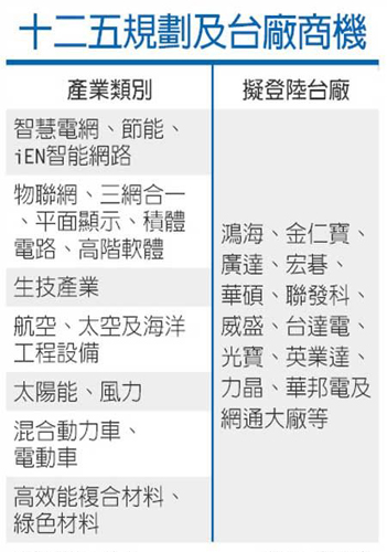 臺媒總結(jié)“十二五”規(guī)劃給臺商帶來的商機(jī)。 來源:《工商時報》
