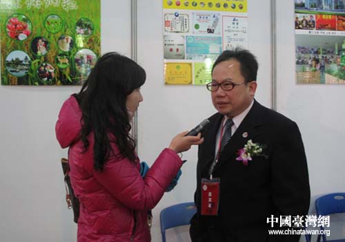 率隊(duì)參加展銷會(huì)的臺(tái)灣海峽農(nóng)業(yè)基金會(huì)董事長(zhǎng)黃一鐘接受媒體采訪(荊州市臺(tái)辦通訊員 張青松 攝)
