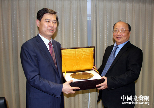 濟(jì)南市委副書記、市長楊魯豫與臺(tái)中市市長胡志強(qiáng)互贈(zèng)禮物。(圖片來源:濟(jì)南市臺(tái)辦)