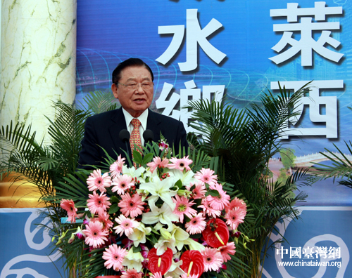 海基會董事長江丙坤致辭,祝賀青島臺灣生態科技園揭牌(萊西市臺辦提供)
