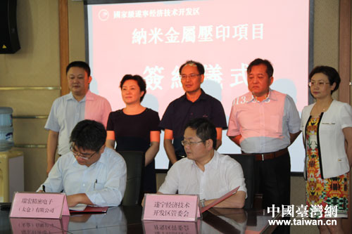 中國臺灣網8月20日遂寧消息 日前,遂寧經濟技術開發區管委會與臺灣仁寶集團全資子公司瑞宏精密電子有限公司簽署合作協議,在遂寧經濟技術開發區臺商工業園建設納米金屬壓印材料生產基地。市委副書記、國開區黨工委書記楊天宗,市政府副市長鄧為,瑞宏精密電子(太倉)有限公司總經理陳進益等出席簽約儀式并見證項目簽約。市投促委、國開區等相關單位負責人參加簽約儀式。