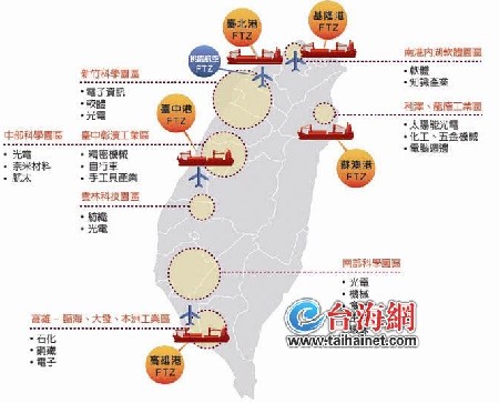 2013年,臺“行政院”核定了“自由經(jīng)濟示范區(qū)規(guī)劃方案”,希望透過“六海一空一農(nóng)技”的規(guī)劃,將自由貿(mào)易范圍由“區(qū)內(nèi)”逐漸擴大到全臺灣。也就是說,“六海一空一農(nóng)技”是臺灣走向自由貿(mào)易的基石和起點。在這個提法之中,除去屏東農(nóng)業(yè)生技園區(qū)之外,其他“六海一空”恰好是臺灣最為重要的海運和空運港口所在地。在臺當局自由經(jīng)濟示范區(qū)的兩階段推動計劃中,今年8月啟動的第一階段規(guī)劃強調(diào)在“六海一空”自由貿(mào)易港區(qū)內(nèi)采用“前店后廠”概念,在智慧運籌、農(nóng)業(yè)價值運銷及國際產(chǎn)業(yè)合作等領(lǐng)域,促進人員、商品與資金自由流動。