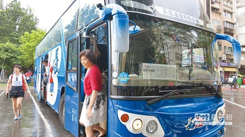 5月27日,大陸無錫的高端團赴臺,游覽車上還特別標明“首發高端團”。資料照片:臺灣“中時電子報”