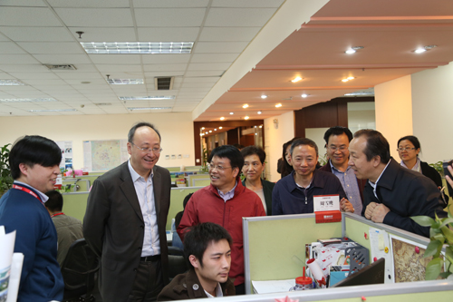 四川省委副書記尹力(左二)在臺資企業縱橫壹旅游科技有限公司調研。