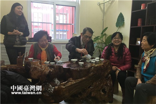 高雄本安里里長(zhǎng)林辛福擔(dān)任核桃園社區(qū)榮譽(yù)主任,到為老中心與社區(qū)大媽喝茶,話家常。(中國(guó)臺(tái)灣網(wǎng) 段雯婷 攝)