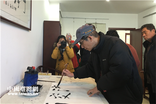 在核桃園社區(qū),高雄本安里里長(zhǎng)林辛福練書法。(中國(guó)臺(tái)灣網(wǎng) 段雯婷 攝)