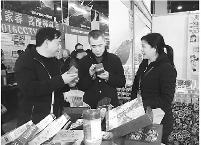杭州市臺辦工作人員在臺企展區查看臺灣產品。(杭州市臺辦供圖)