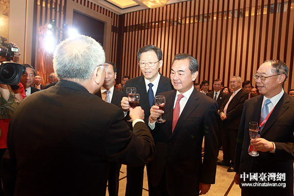 19日晚間,2012海峽兩岸企業家紫金山峰會舉行閉幕酒會。圖為中共中央臺辦、國務院臺辦主任王毅(中),江蘇省省長李學勇(左),兩岸共同市場基金會最高顧問錢復(右)共同舉杯。(中國臺灣網 王偉 攝)