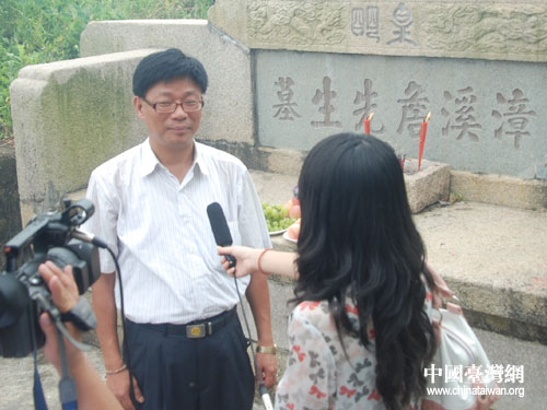 臺灣詹氏宗親總會秘書長詹儒德在“詹御史”墓前祭拜,并接受采訪。(漳浦縣臺辦 陳文亮 攝)