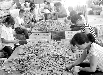 近年來,龍海市工商局通過深入臺商投資的食品企業(yè)調查,發(fā)現(xiàn)許多食品企業(yè)生產(chǎn)需要大量的黃秋葵,于是積極引導多家臺企與當?shù)貣|園鎮(zhèn)、海澄鎮(zhèn)村民簽訂訂單合同。日前,黃秋葵大獲豐收,當?shù)剞r(nóng)戶種植黃秋葵每畝純收入可達3500元,該市有東園鎮(zhèn)、海澄鎮(zhèn)訂單種植黃秋葵面積達6000多畝,農(nóng)民可增收2000多萬元。鄭愛國 宋文龍 攝