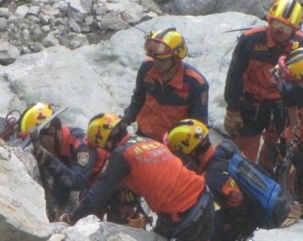 包括臺北市和臺北縣支援的搜救人員,昨天一整天都在蘇花公路崩塌處仔細搜索,由于山壁陡峭,垂直近乎90度,搜救人員只能在身上綁著繩索,攀爬梯子緩緩下降到谷底,搜索工作困難萬分。