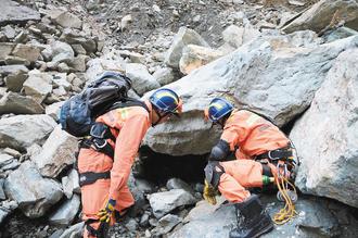 蘇花公路114.5公里巨石遍布,搜救人員在石縫中搜尋游覽車殘骸與失蹤游客。