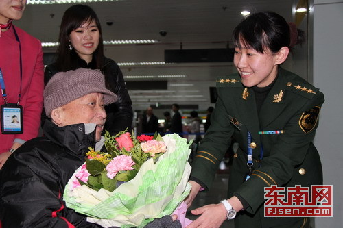 1月9日,春運首日,福州機場邊檢站工作人員為返回臺灣過春節的92歲臺胞朱希仁先生獻花祝福。