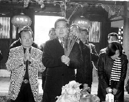 得知李朝卿回鄉謁祖的消息后,楓林村李氏鄉親早早就掛上了歡迎標語;李朝卿一行一下車,鄉親們便敲鑼打鼓,一路上鞭炮煙花,歡呼聲不斷。當天,在李氏宗祠“聞馨祠”,李朝卿攜家人按照當地傳統的閩南風俗舉行了上香、醇酒、祈禱祝福、叩拜等隆重的祭拜儀式(如下圖),并為李氏宗祠和即將修訂的李氏族譜題詞。當得知當地李氏鄉親正籌建通往“聞馨祠”的“淑遜路”時,李朝卿一行慷慨解囊,共捐獻了25萬元用于修路。兩岸李氏宗親血濃于水,李朝卿感慨地說:“這次來南靖祭拜先祖,看到當地語言、各種風俗都與臺灣相通,讓我們倍感親切,兩岸宗親要常常走動,這樣才能親上加親,來年有機會一定再組織臺灣李氏后裔再來尋根謁祖。”