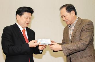 花蓮縣長傅昆萁(左)中午轉交大陸首善陳光標捐贈1500萬支票給南投縣社會處處長熊俊平(右),請熊俊平處長全數轉交給陳綢老奶奶蓋“少年之家”。圖片來源:臺灣《聯合報》