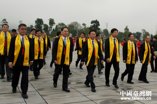 海協(xié)會副會長李亞飛代(左三)、湖南省省長助理袁建堯(左二),臺灣中華神農(nóng)大帝協(xié)進會常務顧問、東莞臺商子弟學校董事長葉宏燈(左一)等兩岸相關負責人步入炎帝陵祭祀廣場。(中國臺灣 高斯斯 攝)