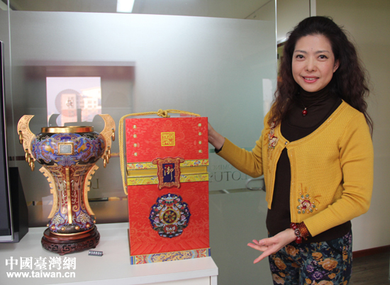 北京市臺聯(lián)理事、晟蓮升文化藝術(shù)發(fā)展有限公司創(chuàng)始人陳燕妮向記者展示公司產(chǎn)品。(中國臺灣網(wǎng) 孟雅詩攝)