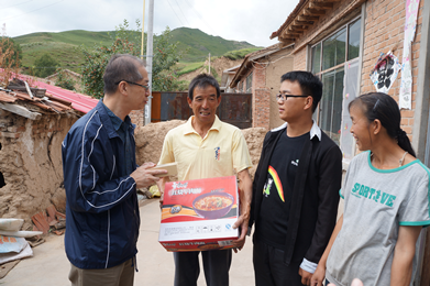 頂新公益基金會理事長騰鴻年為王磊送上方便面和一部手機,希望他今后能多多和父母聯系。