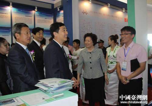 遼寧省副省長劉國強、丹東市委書記戴玉林參觀臺灣昱家科技展位。(圖片來源:丹東市臺辦)