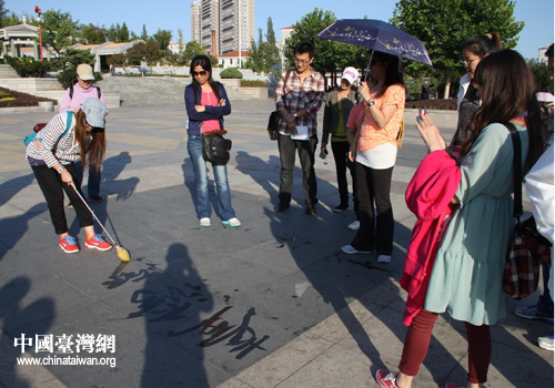 一支長長的塑料筆管,套上一塊海綿制作的軟軟的筆頭,就能在地面上一氣呵成揮寫出剛勁有力或舒展飄逸的草書、行書等各種字體的書法,臺灣同胞禁不住也上前一試。“一江春水向東流、臺灣……”,臺灣同胞專注的神情和一招一式、一筆一畫的認真姿態贏得大家的掌聲。(中國臺灣網丹東市臺辦通訊員 孫國輝)