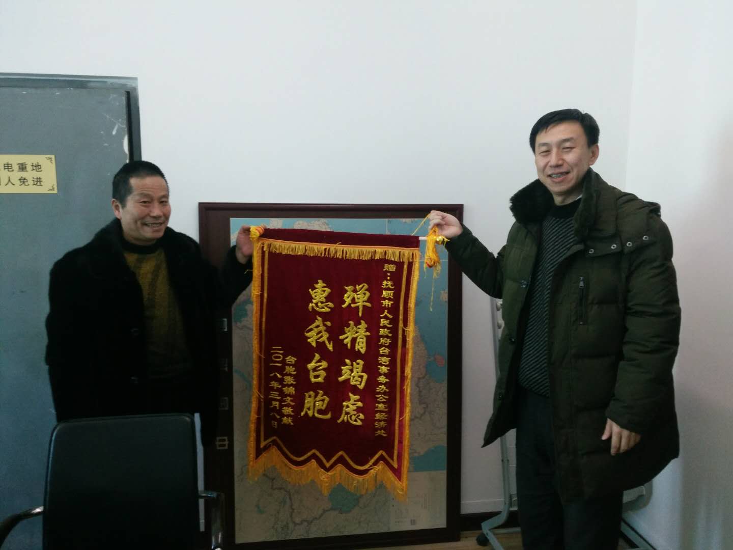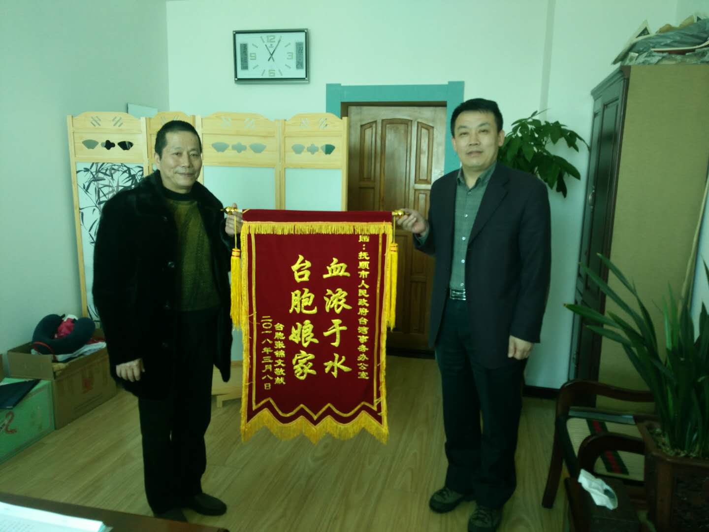 圖為張錦文先生向撫順市臺(tái)辦贈(zèng)送錦旗,表達(dá)作為臺(tái)胞的他與撫順市血濃于水的感情和謝意