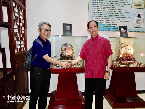 與國家工藝美術大師曹志濤交流瑪瑙雕刻技藝。(圖片來源:阜新市臺辦)