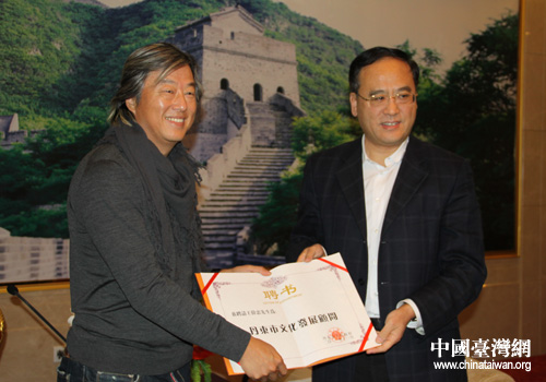 中國臺灣網11月17日丹東消息 日前,丹東市代市長石光在丹東賓館會見了臺灣金星娛樂事業有限公司總經理王偉忠、臺灣海悅廣告股份有限公司董事長黃希文等臺灣客人,并聘請王偉忠、黃希文為“丹東市文化發展顧問”,向二人頒發了聘書。