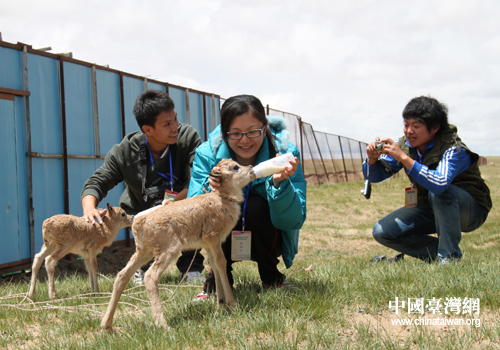 臺灣大學生喂小藏羚羊(圖片來源:青海省臺辦)