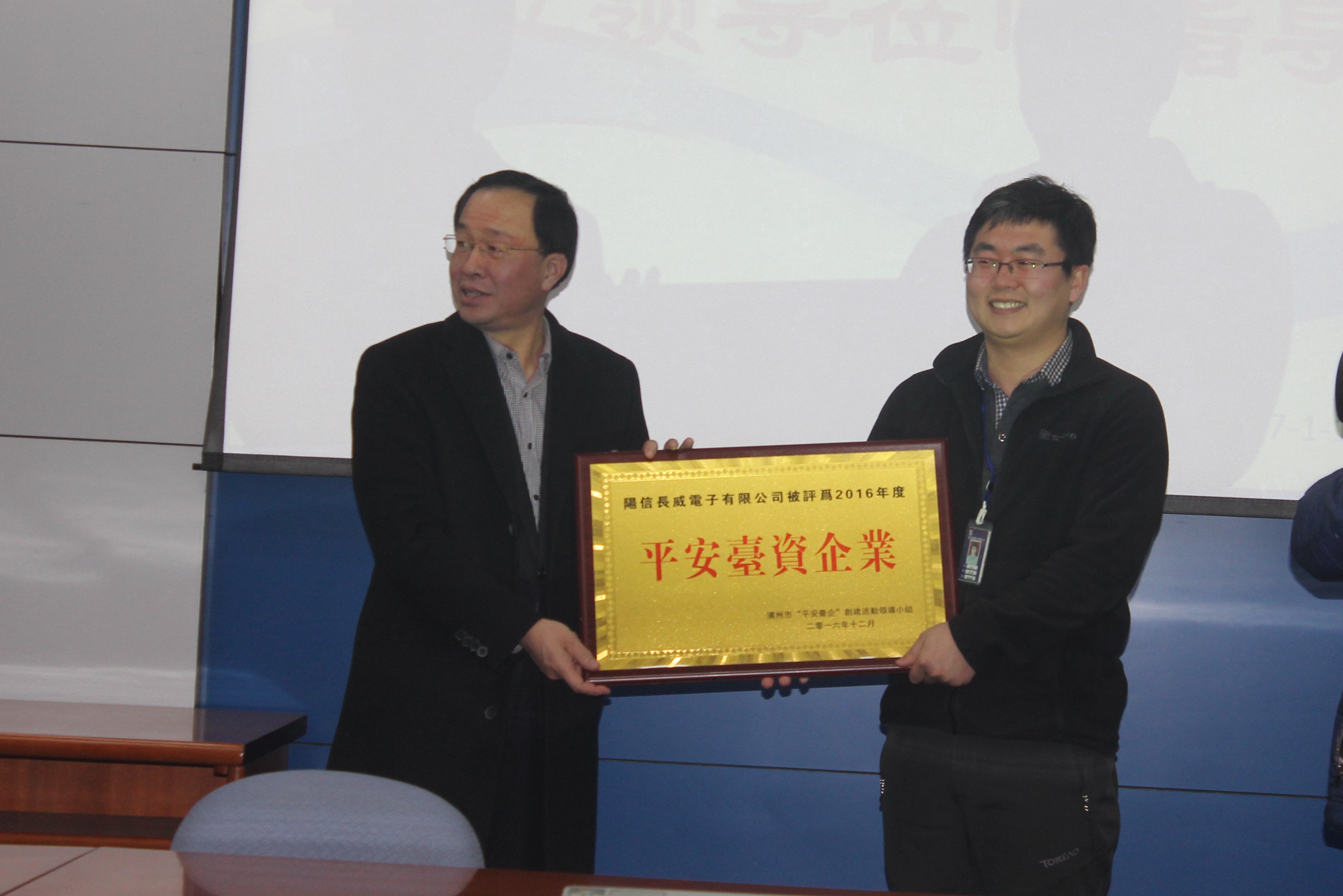 在市、縣(區(qū))黨委、政府的領(lǐng)導(dǎo)、關(guān)心和支持下,在市、縣(區(qū))有關(guān)部門的組織推動(dòng)和臺(tái)協(xié)會(huì)、新聞媒體等社會(huì)力量的積極配合下,在臺(tái)資企業(yè)的積極參與下,“平安臺(tái)企”創(chuàng)建活動(dòng)圓滿結(jié)束,并取得了顯著成效。經(jīng)過對(duì)照標(biāo)準(zhǔn),嚴(yán)格評(píng)審,全市有五家臺(tái)資企業(yè)達(dá)到“平安臺(tái)企”標(biāo)準(zhǔn),被濱州市臺(tái)辦、市綜治辦、市公安局、市司法局、市住建局、市商務(wù)局、市衛(wèi)計(jì)委、市環(huán)保局、市工商局、市質(zhì)監(jiān)局、市安監(jiān)局、市食藥局十二部門聯(lián)合命名為“2016年度平安臺(tái)資企業(yè)”,分別是陽信長威電子有限公司,山東六豐機(jī)械工業(yè)有限公司,濱州大潤發(fā)商業(yè)有限公司,惠民云淞源農(nóng)業(yè)科技有限公司,濱州伸鑫紡織有限公司。12月31日,市十二個(gè)部門聯(lián)合發(fā)文命名公布了這五家“2016年度平安臺(tái)資企業(yè)”名單,同時(shí),以濱州市“平安臺(tái)企”創(chuàng)建活動(dòng)領(lǐng)導(dǎo)小組名義為這五家“2016年度平安臺(tái)資企業(yè)”頒發(fā)了匾牌。