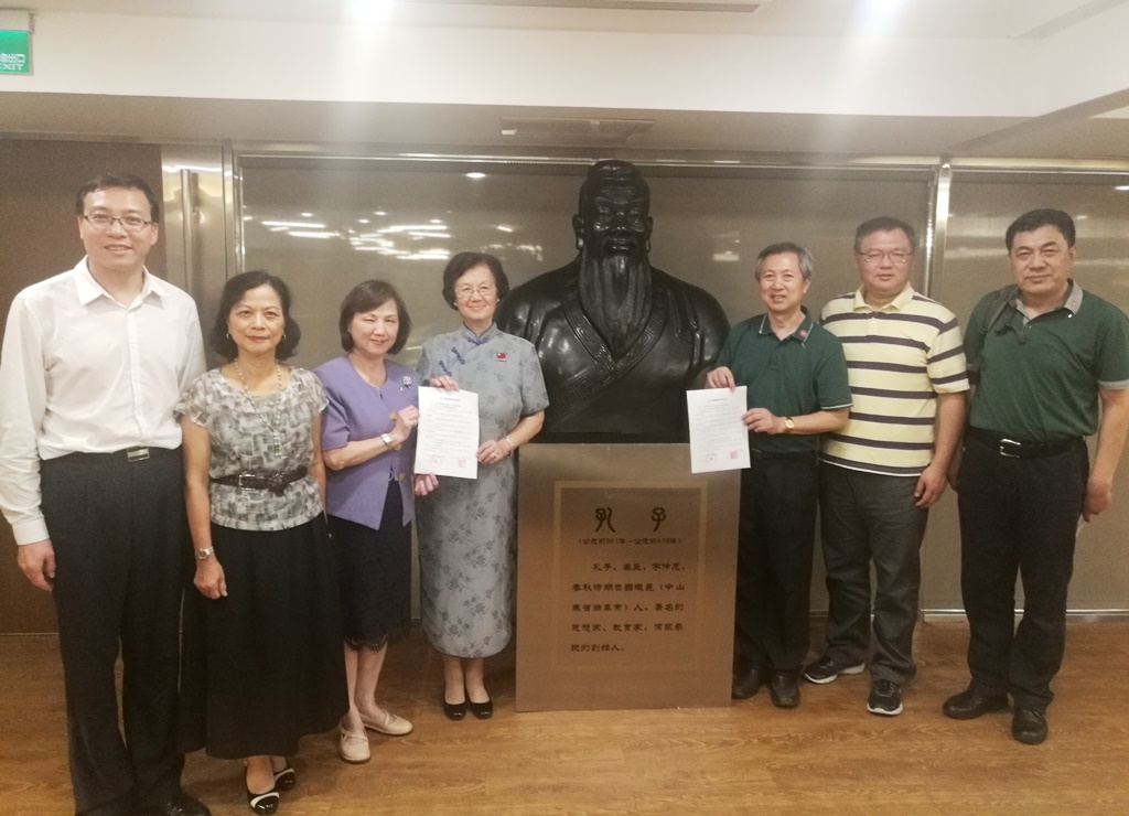 曹曉武副主任等在臺期間先后拜會了臺北復興實驗高級中學董事長李尹緒瑛、校長張碧娟,薇閣小學校長紀紹仁,新北南山中學董事長王繼光、校長蔡銘城,實踐大學總務長葉立仁,中國文化大學校長李天任,中華華夏文化交流協會副理事長翁嵩慶,義守大學副校長李樑堅,新竹忠信文教基金會創始人、榮譽董事長高天極等,就山東省海峽兩岸經濟文化發展促進會向這些單位贈送孔子塑像相關事項進行研商,并辦理了贈送孔子塑像交接手續,雙方還就其他交流合作事項進行了商討。