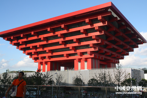 同學(xué)們一個(gè)接一個(gè)地在雄偉的中國(guó)館前拍照留念。(中國(guó)臺(tái)灣網(wǎng) 肖燕 攝)