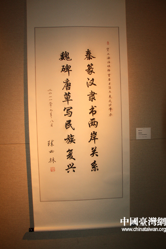 海協會會長陳云林書法作品“秦篆漢隸書兩岸關系 魏碑唐草寫民族復興” (中國臺灣網 李桂英 攝)