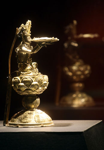 “盛世皇朝秘寶─法門寺地宮與大唐文物特展”28日在臺(tái)北歷史博物館舉行開幕記者會(huì),展品中超過一半是大陸1級文物。圖為敬獻(xiàn)佛指舍利的捧真身菩薩。 圖片來源:“中央社”