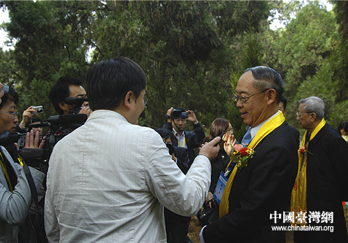 錢復先生將阿里山的土、日月潭的水灑在栽植的“同根同源”紀念樹下。(圖片來源:陜西省臺辦)