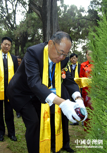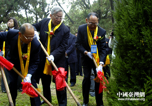 錢復先生將阿里山的土、日月潭的水灑在栽植的“同根同源”紀念樹下。(圖片來源:陜西省臺辦)