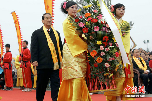 4月5日上午,中國·洪洞二十一屆大槐樹尋根祭祖大典在山西洪洞大槐樹尋根祭祖園舉行,中國臺灣親民黨主席宋楚瑜參加大典。圖為親民黨主席宋楚瑜祭祖敬獻花藍。中新社發 張云 攝