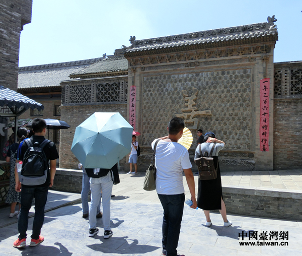 在講解員的引導下,臺灣青少年參訪團一路穿堂過巷走過中西合璧的李家大院。如果不是導游帶路,初來乍到的臺灣青少年肯定會在布局復雜的千畝大院中迷失方向。李家大院中最引人矚目的就是用365個不同的善字雕飾的百善壁,而這正是李家大院“善文化”的標志性建筑,臺灣青少年紛紛在墻壁下留影紀念。